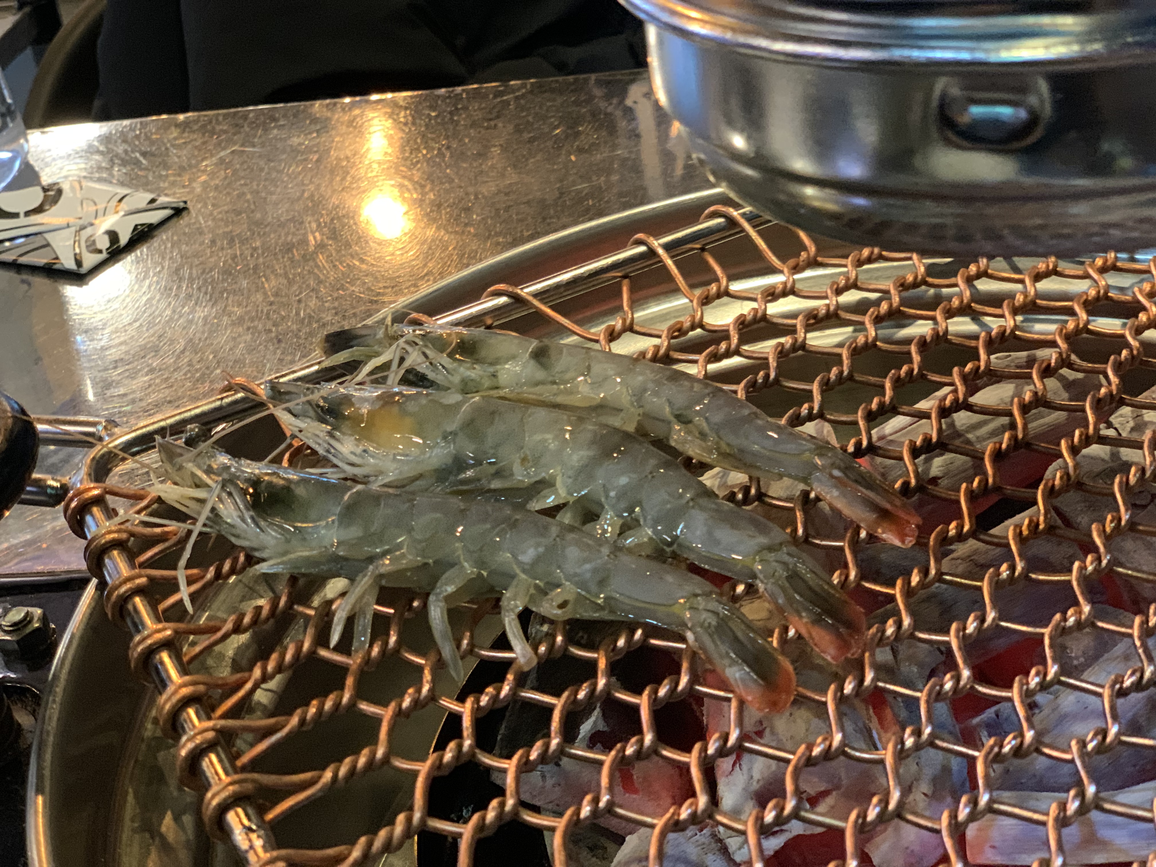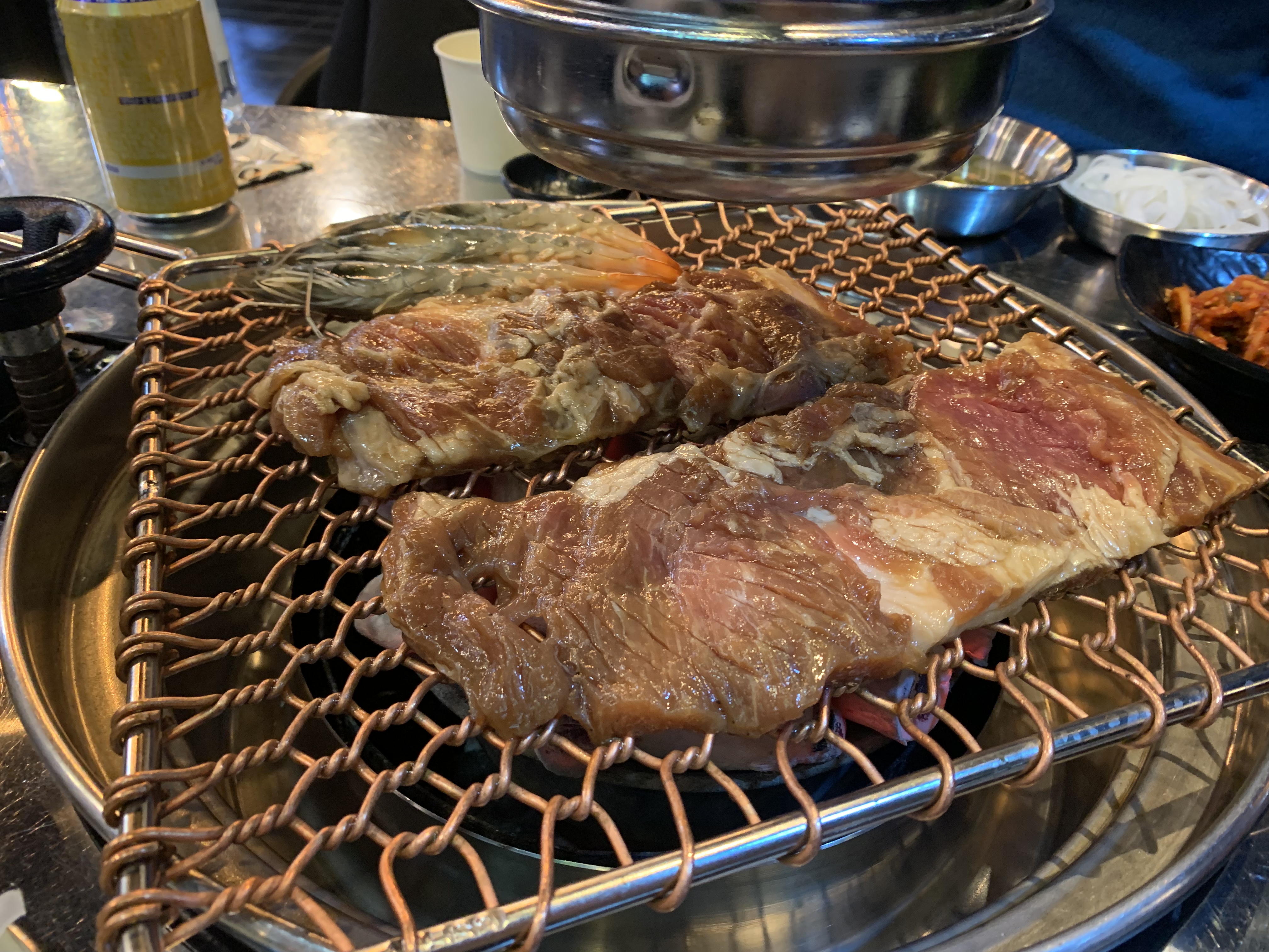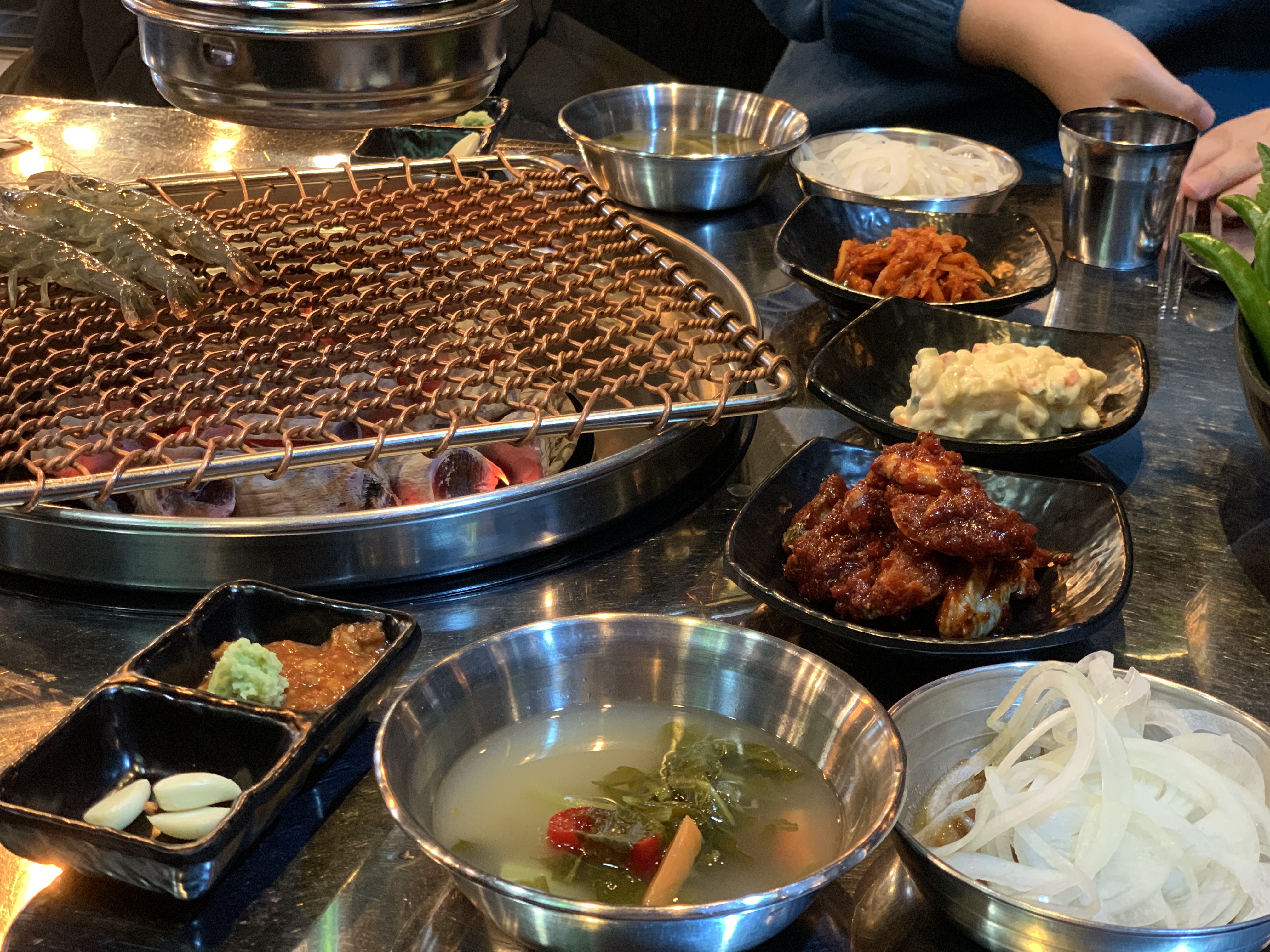 고기 인분에 맞게 새우도 주시는 듯..! 숯불에 구워먹고 까라고 사장님이 비닐장갑도 챙겨주셨다. 고기는 양념고긴데 사장님이 불판에 달라붙지 않는다고 ! ㅇ0ㅇ!! 자부심이 있으신 것 같더라 !! 밑반찬 종류도 꽤 되는데 동치미같은 것도 일인당 한개씩 주시고 양파절임..! 갈비는 양파절임이지.. 그리고 진짜 대박인 것이 양념게장이 나옴..!!! 밥 추가해서 양념게장이랑 밥먹고 고기는 냉면이랑 ㅠㅠ 먹을 생각에 두근했음. 그리고 특이하게..? 다른데랑 차별화가 되어 있는 부분같은데 된장찌개가 없고 청국장이 나온다. 청국장이랑 계란찜은 기본으로 나옴~ 그리고 쌈장이 아니고 된장에 와사비를 주심..! 섞어서 갈비랑 먹으라고 하시더라.. 특이하고 소스 맛있다..!